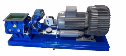 Anläggningen är utrustad med en tryckregulator (Danfoss Pressostat), manometer, backventil och inloppsfilter. Systemet reglerar produktmängden automatiskt. Backventilen hindrar produkten från att komma in i fläkten vid oavsiktligt stopp. Pressostaten är ansluten till slussen, så att slussen kan stoppa inmatningen av produkten, för att förhindra uppbyggnad av övertryck i rörsystemet. När trycket återgår till “normal”, börjar slussen igen att mata produkten in i rörledningen.