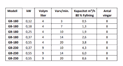 - Cellsluss GB-230 1,1 kW. Kapacitet vid 80% Fyllning 6,0 m³ / h