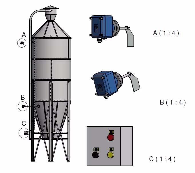 I nivåvaktspaketet ingår även kablage, fästplåt och kopplingslåda med transformator som är monterade på silon.
