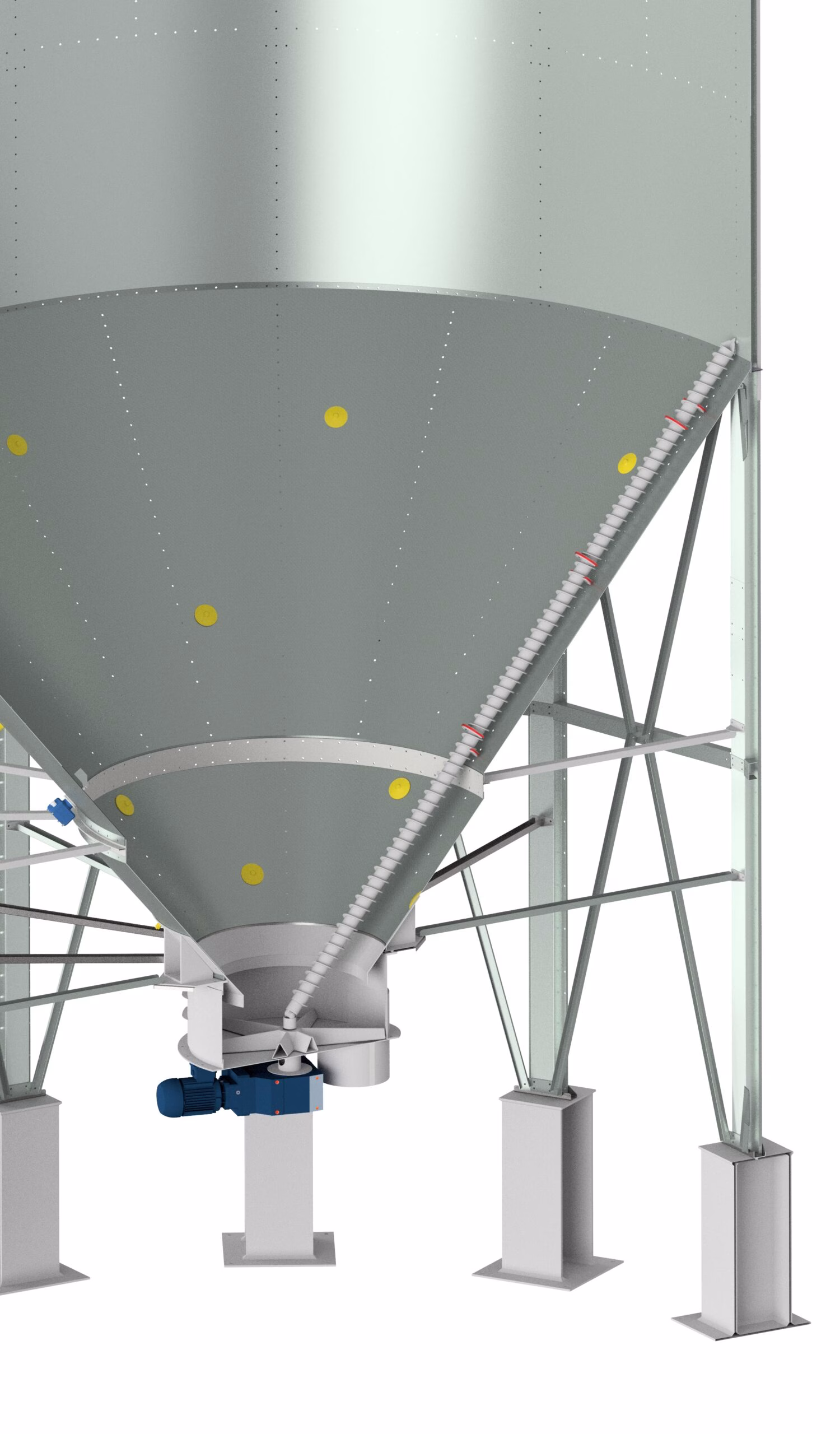 Genom att vibrera hela bottenkonen kombinerat med en avlastningskon börjar de mest trögaste bulkvarorna att flöda och valvbildning kan elimineras.