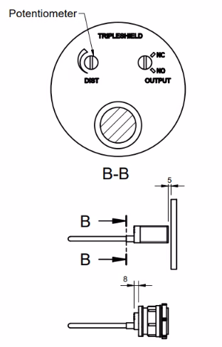 vid ett avstånd på ca 5 mm. Om detta inte stämmer bör givaren justeras genom att vrida potentiometern.