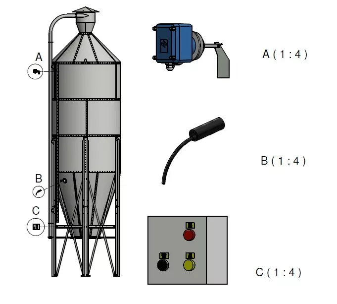 I nivåvaktspaketet ingår även kablage, fästplåt och kopplingslåda med transformator som är monterade på silon.