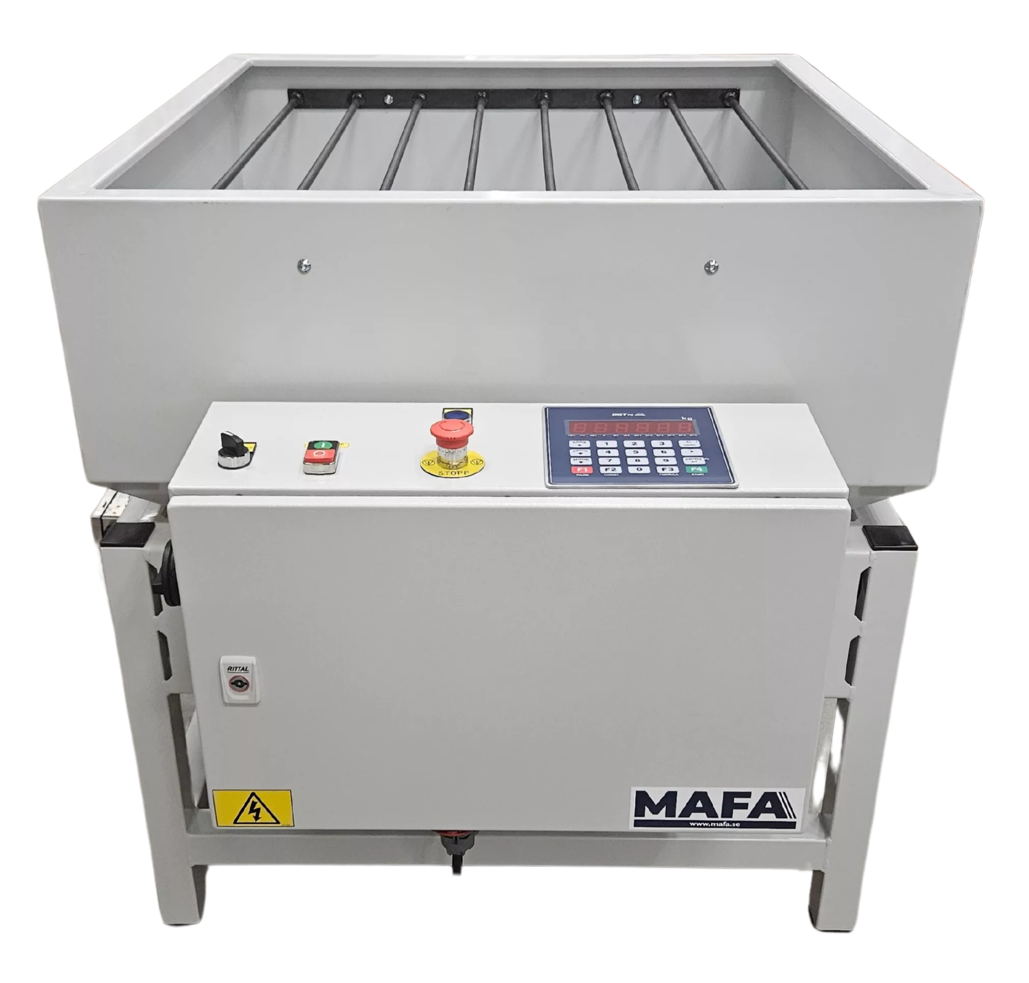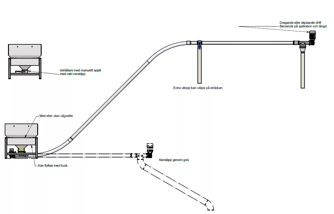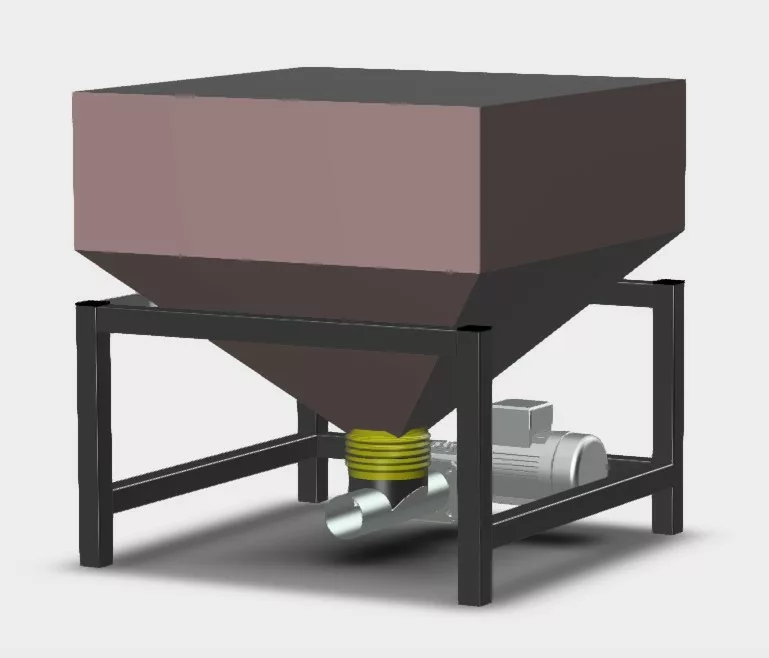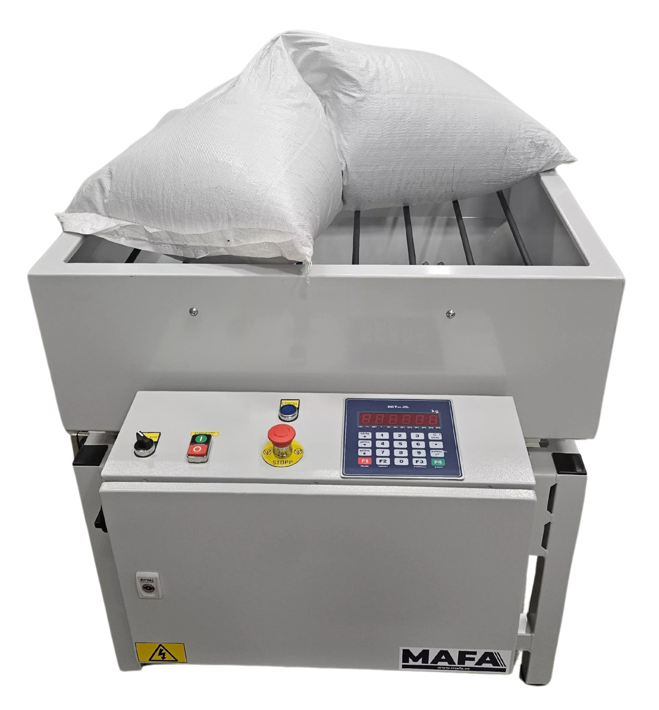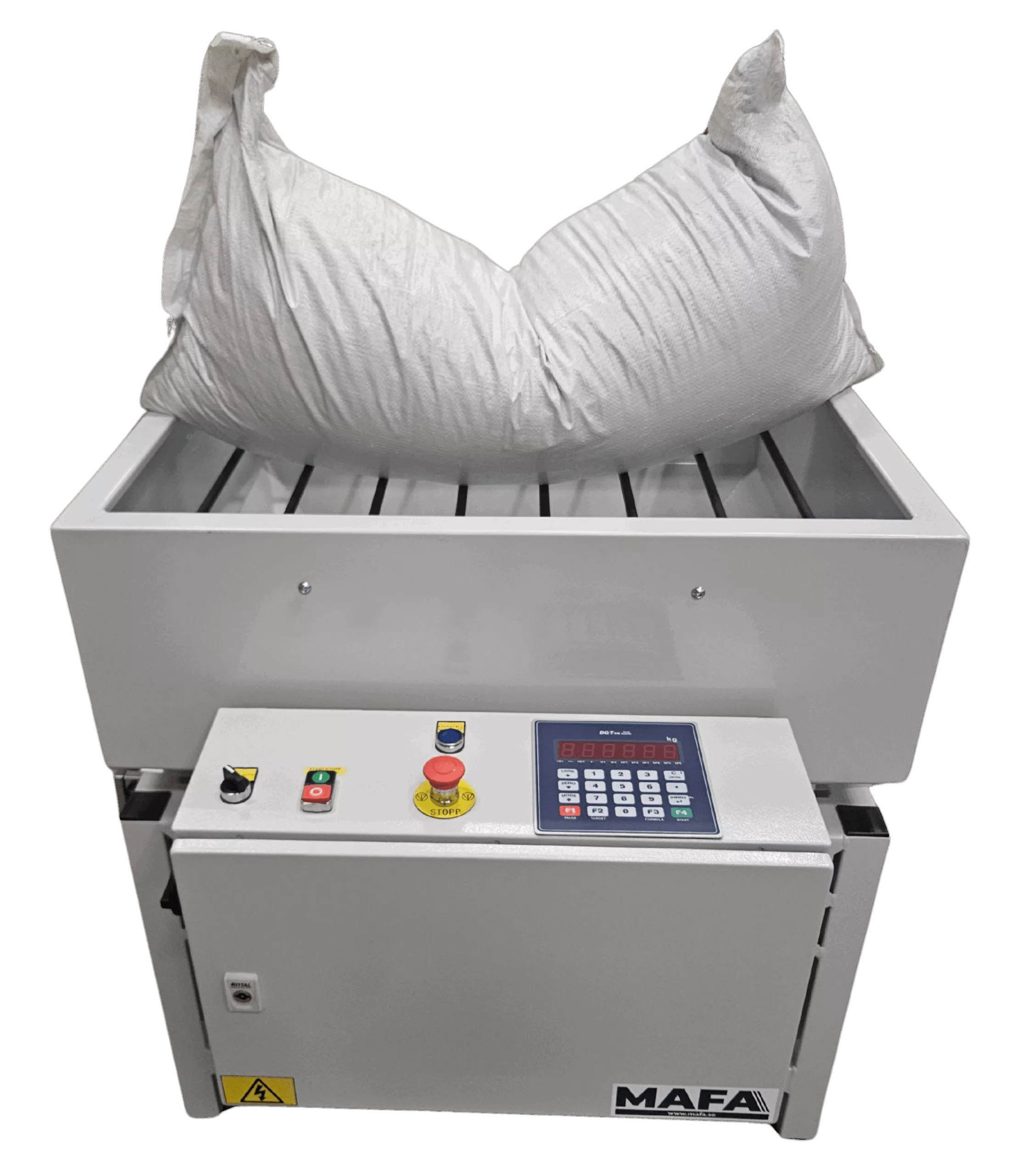 Behållare för tömning och fyllning av småsäck. Behållaren är försedd med galler för att kunna lägga säcken på) och vågceller (för att enkelt väga) och är anpassad för att flyttas med en handtruck.